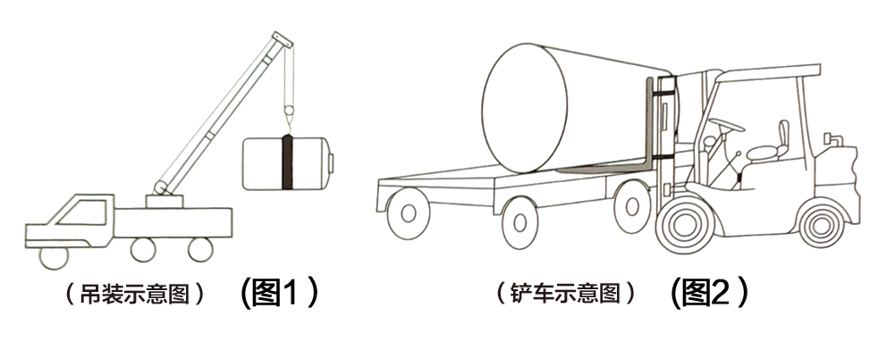 2、卸貨或吊裝(zhuāng)產品時,嚴(yán)禁用水箱上配置的接(jiē)口或法蘭作為受力點,正確的(de)卸貨方式(shì)如下:(圖1-圖2);